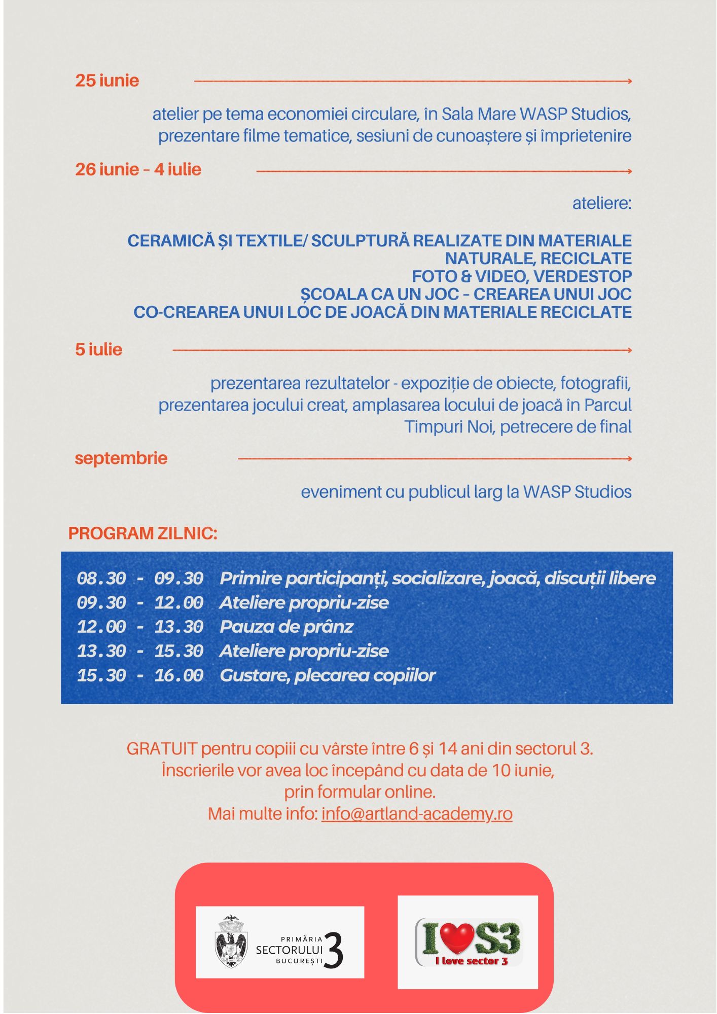 Asociația ARTLAND ACADEMY are bucuria de a organiza în perioada 25 iunie – 5 iulie ȘCOALA DE VARĂ ECOART, proiect finanțat de Primăria Sectorului 3, prin fonduri nerambursabile de la bugetul local, și dedicat copiilor cu vârste între 6 și 14 ani.